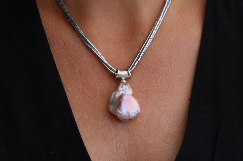 El collar Acapulco nos lleva a vivir el mar y la espuma de este histórico puerto. Su perla barroca es excepcional, transmite poder y confianza y sus hematitas plateados refuerzan la energía que llevamos.