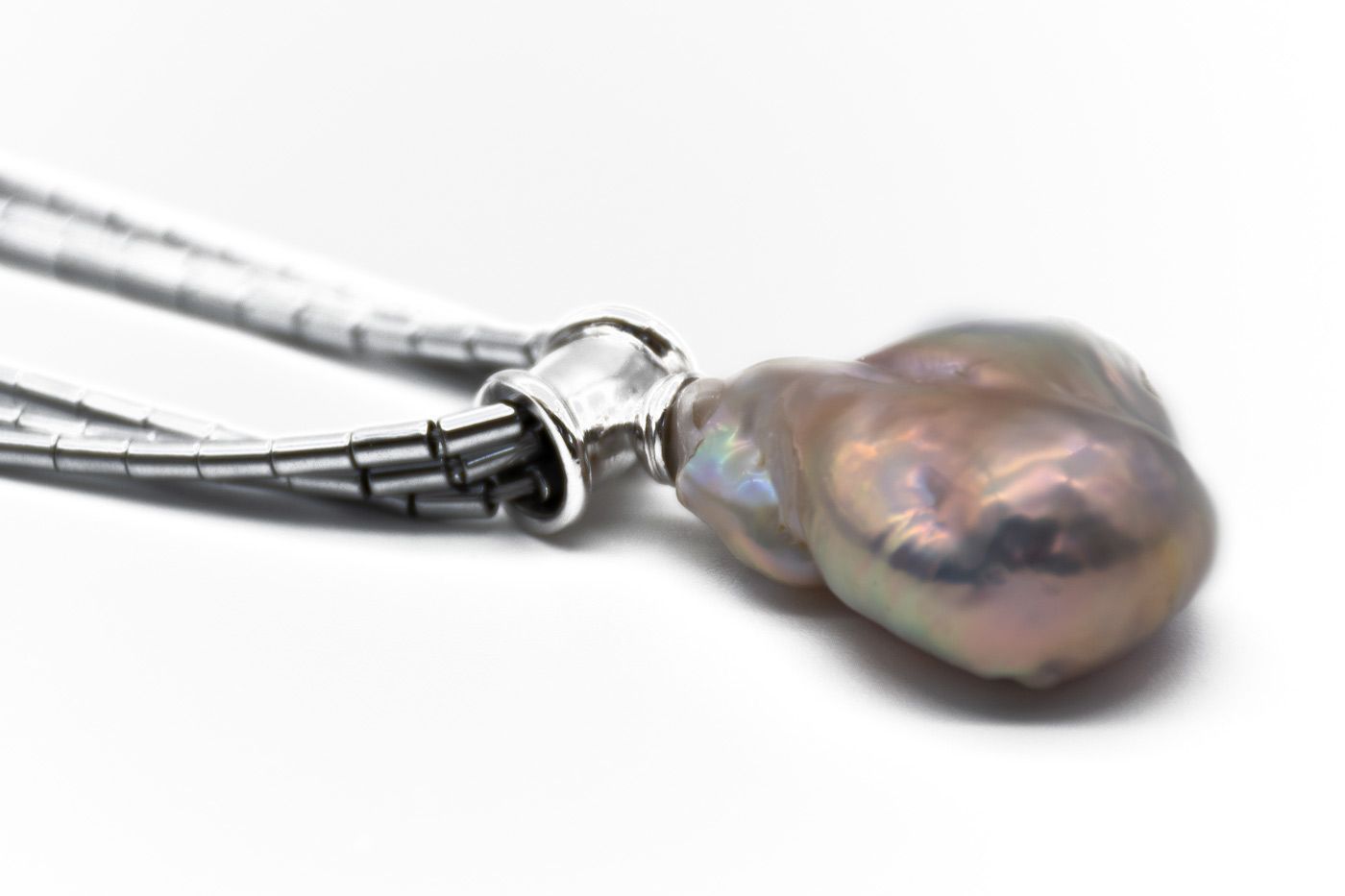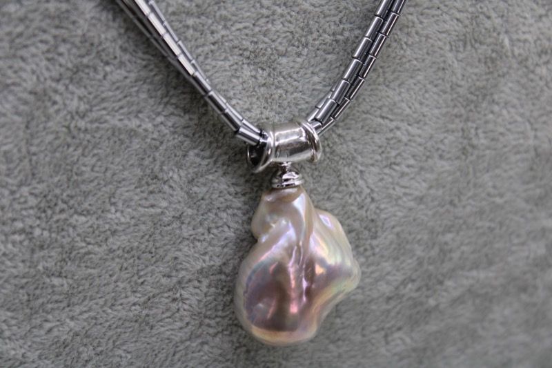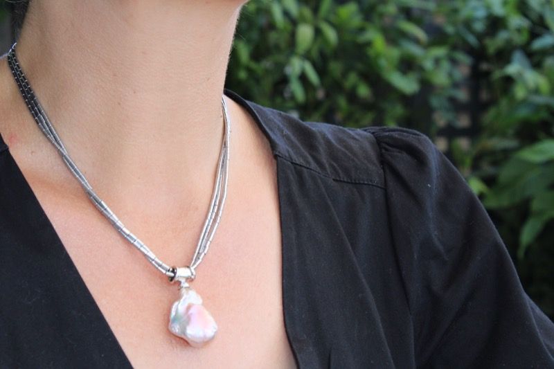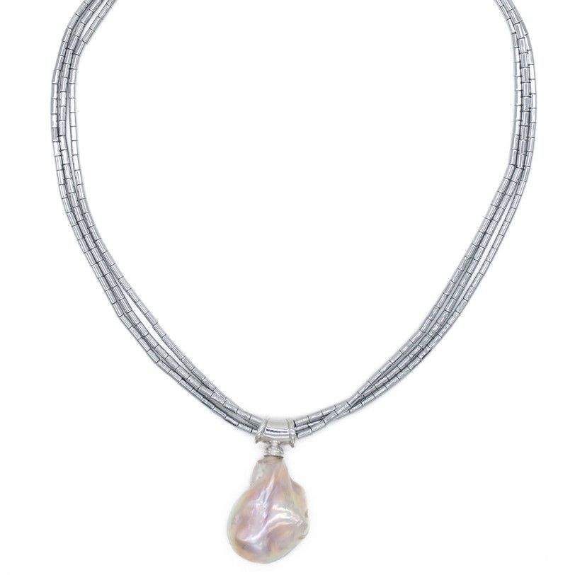 Collar de hilos de hematitas plateadas de Brasil y colgante perla barroca procedente de aguas del Sudeste asiático. El collar mide 45 cm y la perla barroca 16 mm de largo y 10 mm de grosor. Cierre magnético.