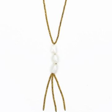 Collar ópera de hematita dorada con tres perlas barrocas de 10 mm de grosor.