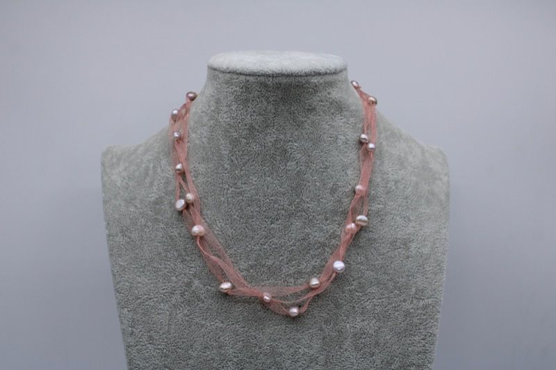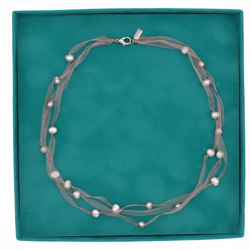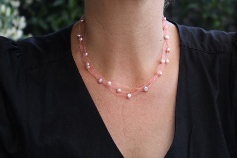 Collar princesa de 41 cm de largo de tres hilos de gasas color rosa liso satinado con perlas rosas naturales. Cierre en muesca.
