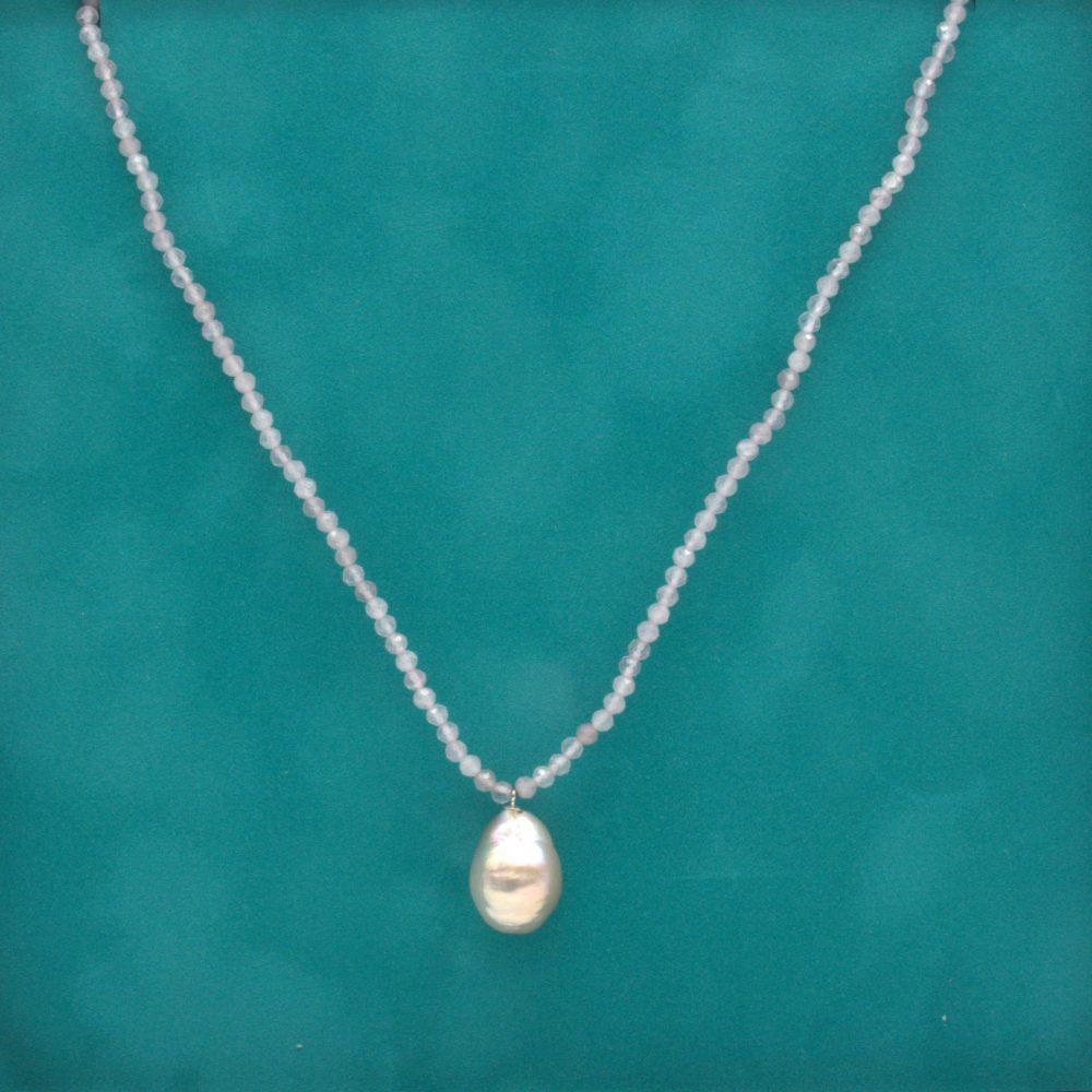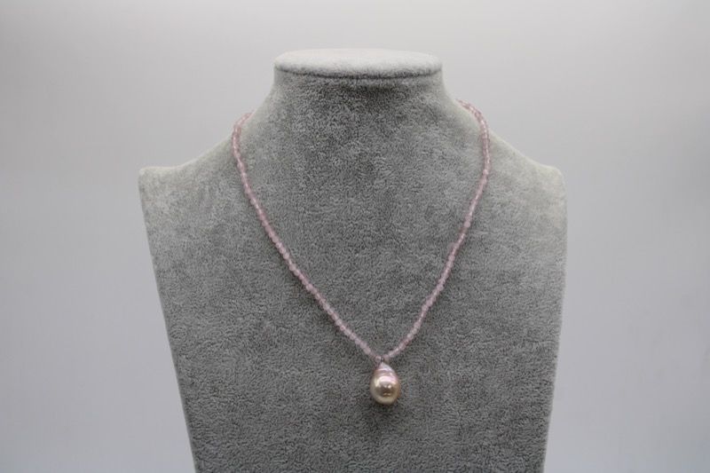 Gargantilla de 43 cm de largo de cuarzos rosas y perla rosa natural de 13 mm de grosos procedente de aguas dulces del sudeste asiático. Cierre magnético con pedrería.