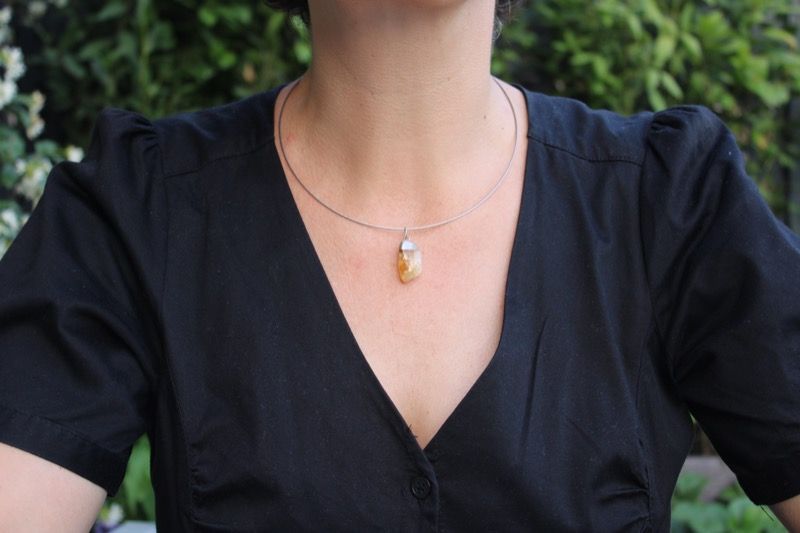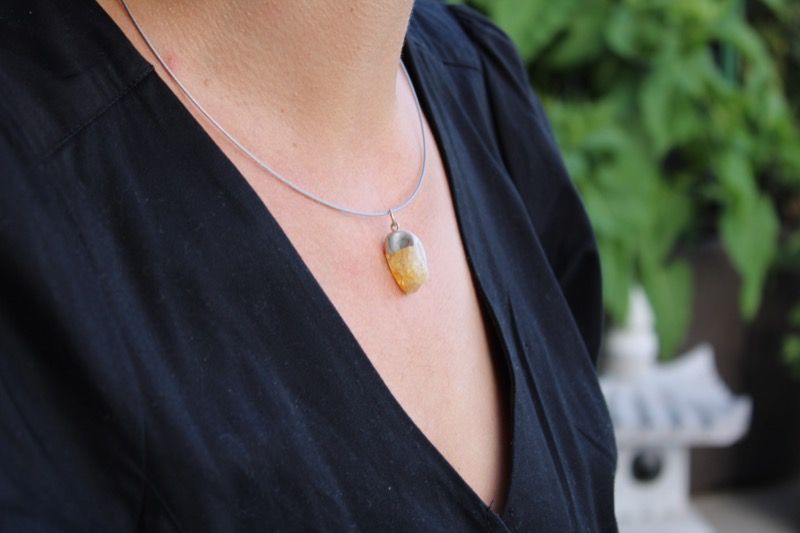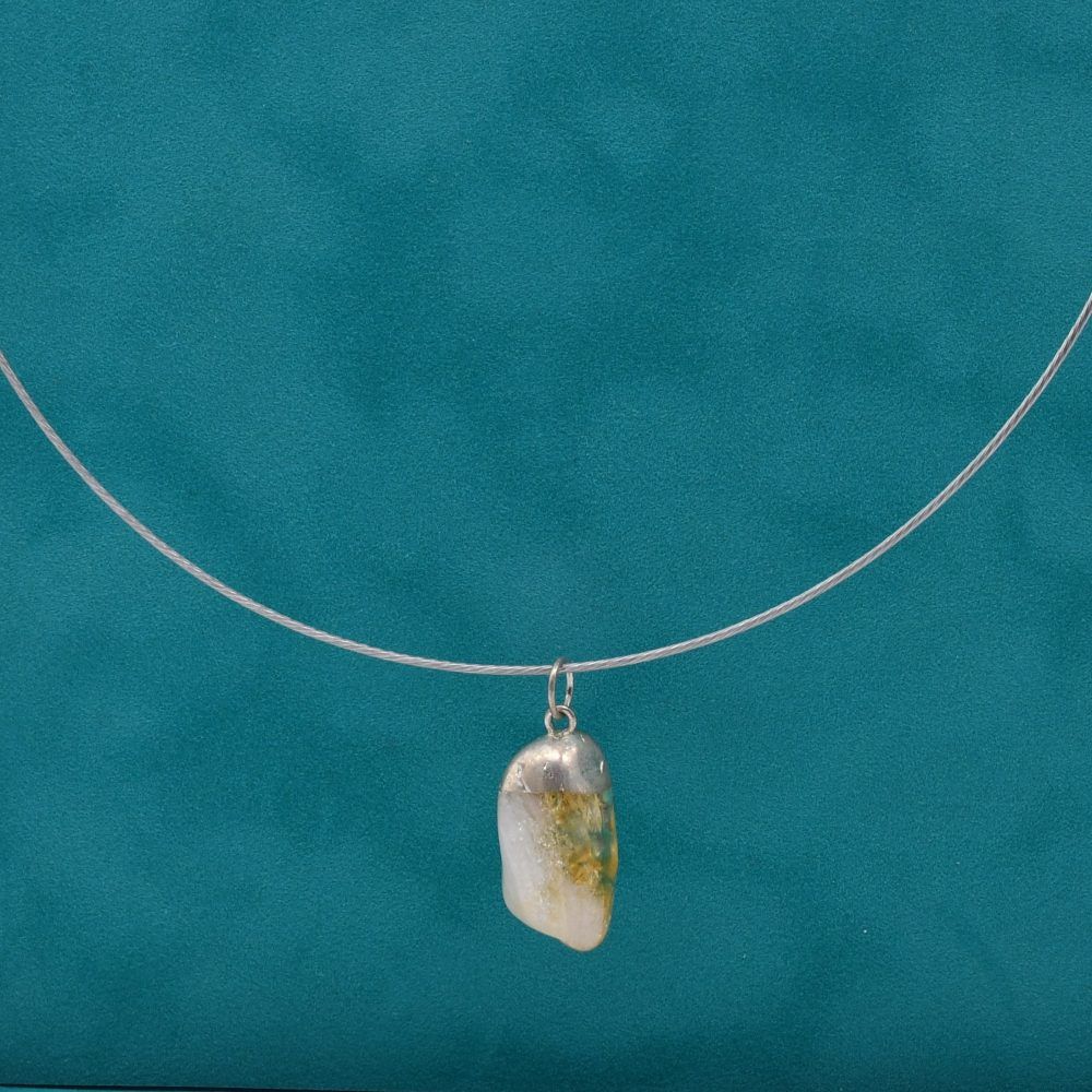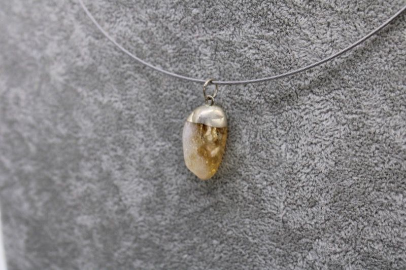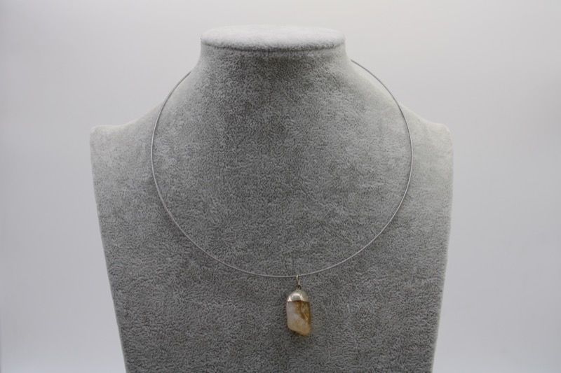 Gargantilla rígida plateada con combinación de colgante plateado y cuarzo citrino procedente de Brasil. Cierre a rosca.