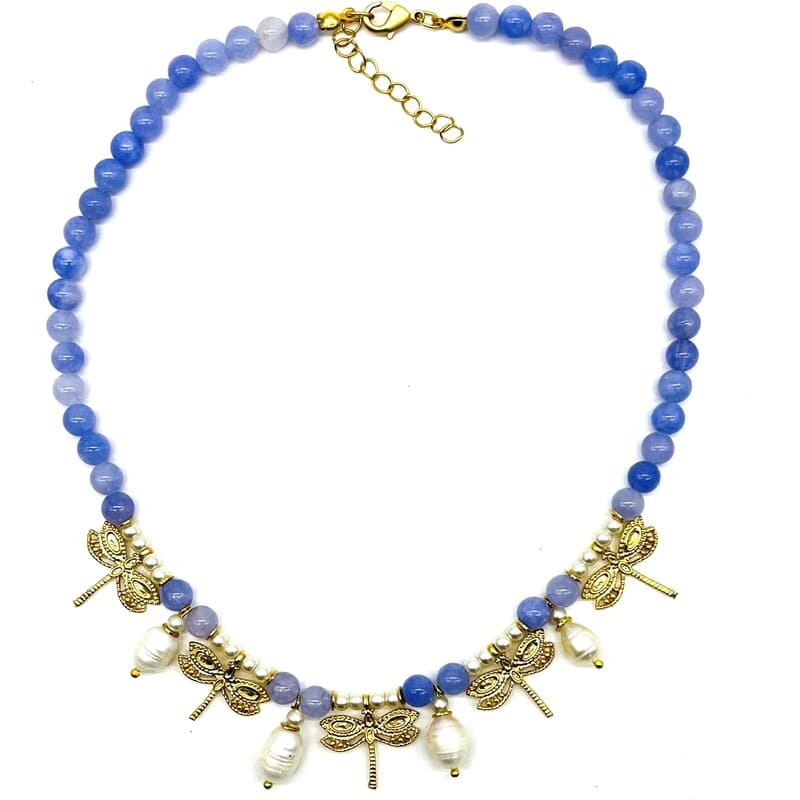 Gargantilla de cuarzo azul con perlas naturales y detalles de mariposas doradas. Cierre con extensión en dorado.
