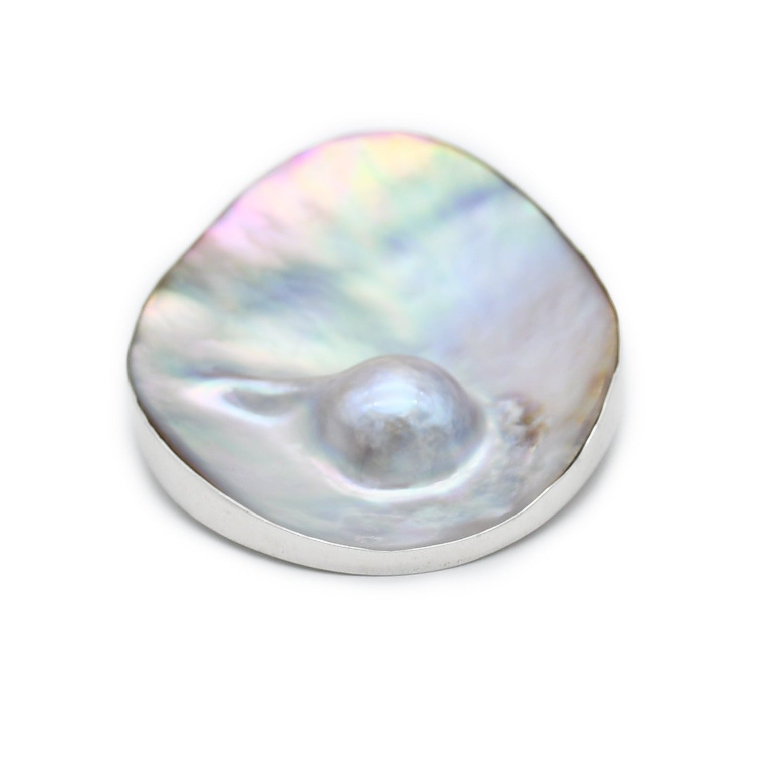 Medallón-Colgante único de concha natural con perla incrustada. Laterales bañados en plata de ley 925. Combinación con gargantilla en cuero marrón y cierre plateado indispensable para un aspecto elegante y sofisticado.