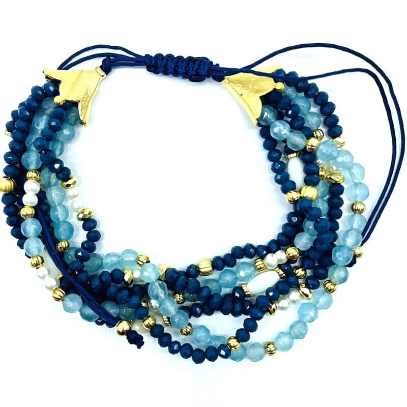 Pulsera múltiple de cuarzo azul y celeste con detalles de perlas alargadas. Cierre ajustable en cuerda y detalles en flores doradas.