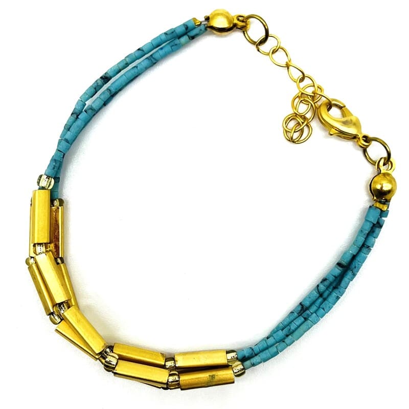 Pulsera triple color turquesa mate con detalles dorados y cierre de extensión dorado.